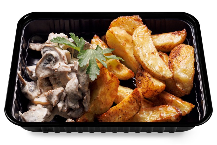 Свинина с грибами в сливочном соусе соусе с картофельными дольками